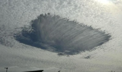 Un cerc perfect, de aproape 50 de kilometri în diametru, s-a deschis în mijlocul stratului de nori, lăsând impresia că cerul a fost „perforat” de o forță invizibilă.