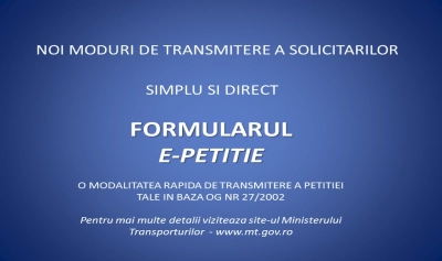 Ministerul Transporturilor anunță că cetățenii au posibilitatea să transmită petiții online, prin intermediul unui formular sau la o adresă de email.