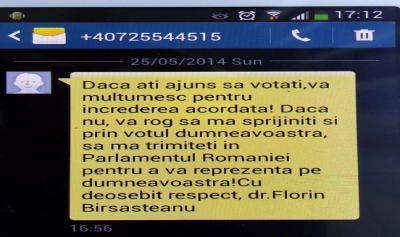 Timişorenii care locuiesc în Colegiul 3 Deputaţi au primit mesaje cu îndemnul de a vota candidatul PSD la parţiale, Florică Bîrsăşteanu. „Dacă aţi ajuns să votaţi, vă mulţumesc pentru încrederea acordată! Dacă nu, vă rog să mă sprijiniţi şi prin votul dumneavoastră, să mă trimiteţi în Parlamentul României pentru a vă reprezenta pe dumneavoastră! Cu deosebit respect, dr. Florin Bîrsaşteanu”, scria în sms.