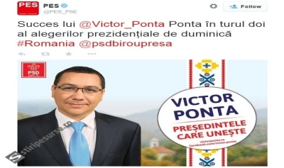 „Succes lui Victor Ponta in turul doi al alegerilor prezidentiale de duminica!”, se arata in mesajul oficial al PES.