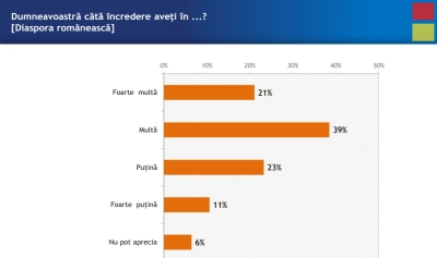 Diaspora si alegerile prezidentiale sunt vedetele anului 2014. Increderea romanilor in disapora a ajuns sa concureze cu increderea in Pompieri, Armata sau Biserica. Institutul Român pentru Evaluare și Strategie – IRES a introdus, în premieră, în topul încrederii diaspora și Facebook, doi dintre actorii determinanți în rezultatul alegerilor prezidențiale din acest an. Chiar dacă diaspora nu este o entitate coagulată și structurată, 60% dintre români spun că au multă și foarte multă încredere în aceasta. În Facebook au multă și foarte multă încredere 42% dintre cei chestionați, în timp ce 39% dintre respondenți susțin că au puțină și foarte puțină încredere.