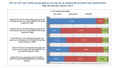 Indicatorii prezentaţi pun problema evaluării unor parametrii fundamentali ai democraţiei, după 25 de ani de postcomunism: libertate, dreptate socială, nivel de trai, organizarea muncii, independenţa justiţiei. În mod evident, caracteristica în privinţa căreia există cel mai mare acord că ar fi un câştig cert al societăţii româneşti postdecembriste este libertatea. Toate celelalte sunt considerate ca existând azi la o cotă inferioară celei din perioada comunistă.