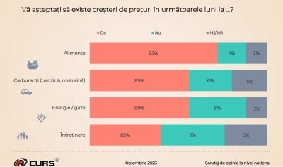 La întrebarea ”vă așteptați să existe creșteri de prețuri?”, românii au arătat că se tem de creșterea prețurilor pentru alimente, carburant, gazele naturale, dar și energie.