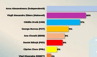 La polul opus, sondajul indică o zonă vizibil mai sensibilă pentru Anca Alexandrescu, candidată independentă, care înregistrează 22% respingere, cel mai ridicat procent dintre cei analizați. Este urmată de Virgil Alexandru Zidaru, cunoscut ca Makaveli, cu 20%, și de Cătălin Drulă, candidat USR, care acumulează un nivel de respingere de 17%. Aceste procente sugerează că cei trei se confruntă cu o polarizare semnificativă în rândul electoratului.
