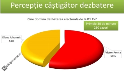 Un sondaj Tip CATI în timpul dezbaterii de la B1 TV arată că în primele 30 de minute cel care a performat a fost premierul Victor Ponta, prezidențiabilul PSD-UNPR-PC-PRM-PPDD. Scorul este însă mult mai strâns decât la dezbaterea de la Realitatea TV.
