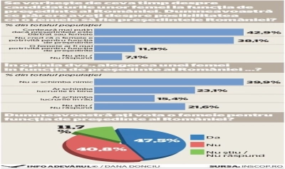 Romanii nu exclud posibilitatea sa le fie chiar mai bine cu o femeie presedinte: 39,9% dintre români cred că alegerea unei femei în funcţia de preşedinte nu ar schimba cu nimic situaţia politică, 23,1% cred că ar schimba lucrurile în bine, 15,4% spun că ar fi mai rău cu o femeie-preşedinte.