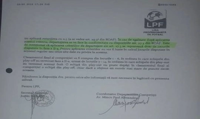 A apărut un document trimis de LPF anul trecut, 29 februarie 2016, echipelor din Liga 1, în care cluburile sunt înștiințate că diferențierea în play-off, în caz de egalitate, se face prin luarea în considerare a jocurilor din play-off.