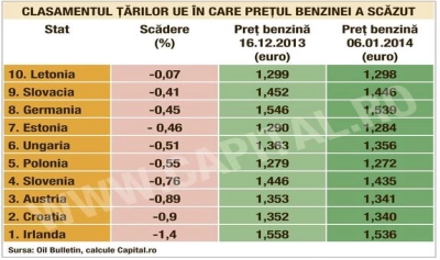 Există însă și zece țări în care benzina s-a ieftinit. De exemplu germanii s-au bucurat de o scădere a prețului benzinei cu 0,45%, de la 1,546 euro la 1,539 euro. Și în Ungaria prețul s-a diminuat cu 0,5%, de la 1,363 euro la 1,356 euro. Benzina s-a ieftinit și în Polonia (0,55%), și în Austria (0,89%). Cea mai mare scădere a prețului a fost înregistrată în Irlanda (1,4%), de la 1,558 euro la 1,536 euro/litru.