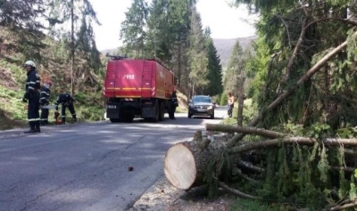 Traficul ruter este întrerupt pe DN12C Bicaz – Gheorgheni, județul Harghita, din cauza unor brazi căzuți pe drum, potrivit Mediafax.