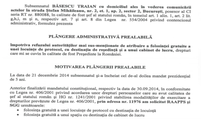 Fostul președinte Traian Băsescu a notificat Guvernul României că l-a acționat în judecată pentru neatribuirea unui imobil pentru folosința sa ca fost președinte al Romaniei.