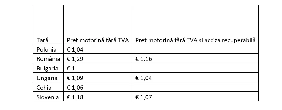 Astfel, prețul litrului de motorină în România, fără TVA și fără acciză, este cu 16% mai mare decât cel din Bulgaria, cu 12% față de Ungaria și Polonia, cu 9% față de Cehia și 8% față de Slovenia.