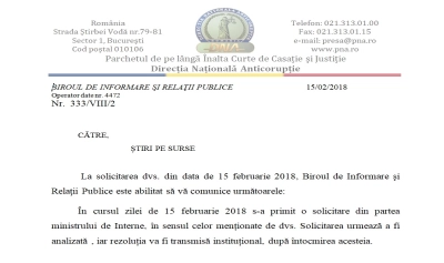 "În cursul zilei de 15 februarie 2018 s-a primit o solicitare din partea ministrului de Interne, în sensul celor menționate de dvs. Solicitarea urmează a fi analizată , iar rezoluția va fi transmisă instituțional, după întocmirea acesteia", precizează DNA.