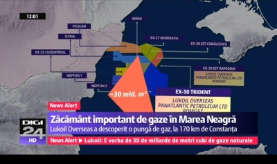 Descoperire importantă în Marea Neagră. Ruşii de la Lukoil Overseas au descoperit un zăcământ de gaze naturale de 30 de miliarde de metri cubi. Zăcământul ar putea asigura necesarul de gaze al României pe o perioadă de trei ani.