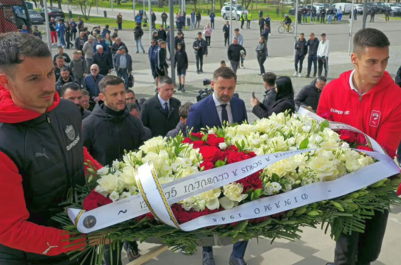 În același timp cu FCSB a ajuns și Dinamo. Primii care au coborât din autocar au fost Zeljko Kopic și Andrei Nicolescu. Dinamo e singura echipă care nu a venit în haine negre la catafalcul lui Il Luce. Opruț și Cîrjan au adus o coroană uriașă cu roșu și alb.