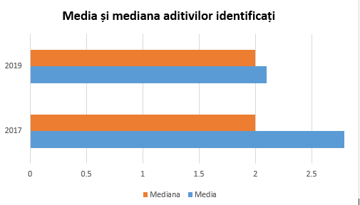 Media numărului de aditivi a scăzut cu 24.19% în 2019, față de media numărului de aditivi identificați în studiul din anul 2017.
