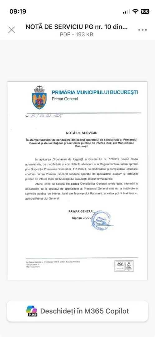 Reprezentanții Uniunea Salvați România critică dur o notă internă atribuită Primăriei Capitalei, prin care Ciprian Ciucu ar urmări să controleze toate informațiile, documentele și datele care ajung la consilierii generali. Potrivit USR, măsura ar reprezenta un derapaj grav de la principiile transparenței și cooperării instituționale într-o administrație democratică.