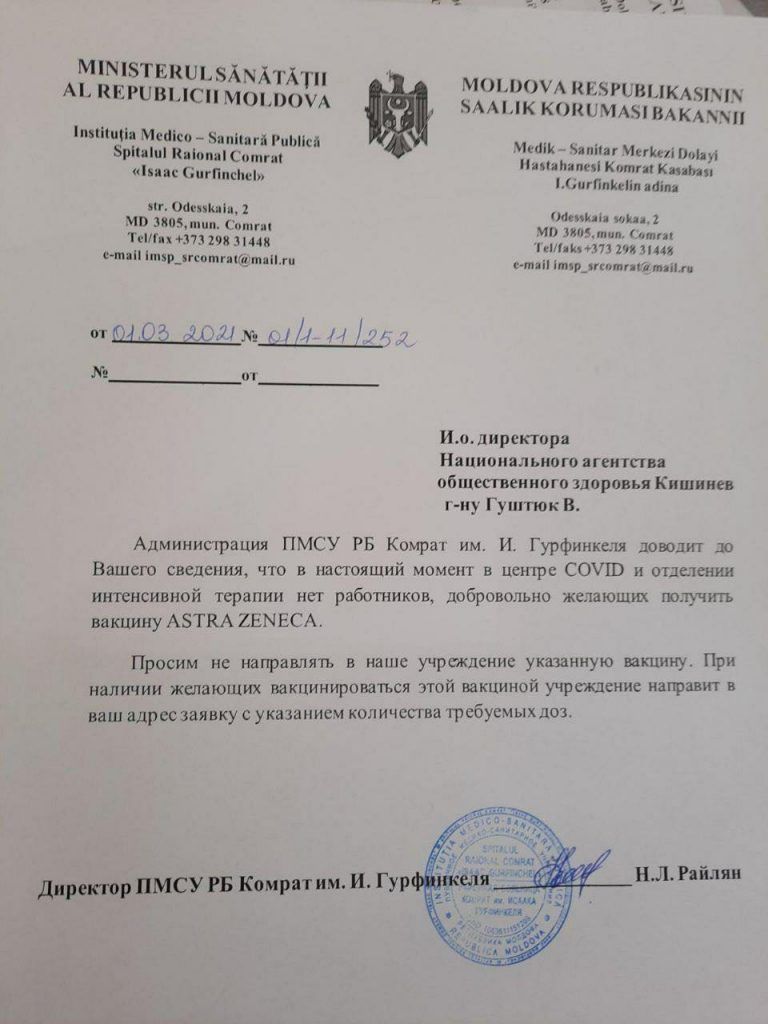 „În prezent în Centrul COVID și în secția terapie intensivă nu sunt lucrători medicali care voluntar ar fi dispuși să se vaccineze cu AstraZeneca. Rugăm să nu distribuiți în instituția noastră vaccinul menționat. În cazul în care vor fi identificați doritori, vă vom informa despre câte doze este nevoie”, se arată în scrisoare.