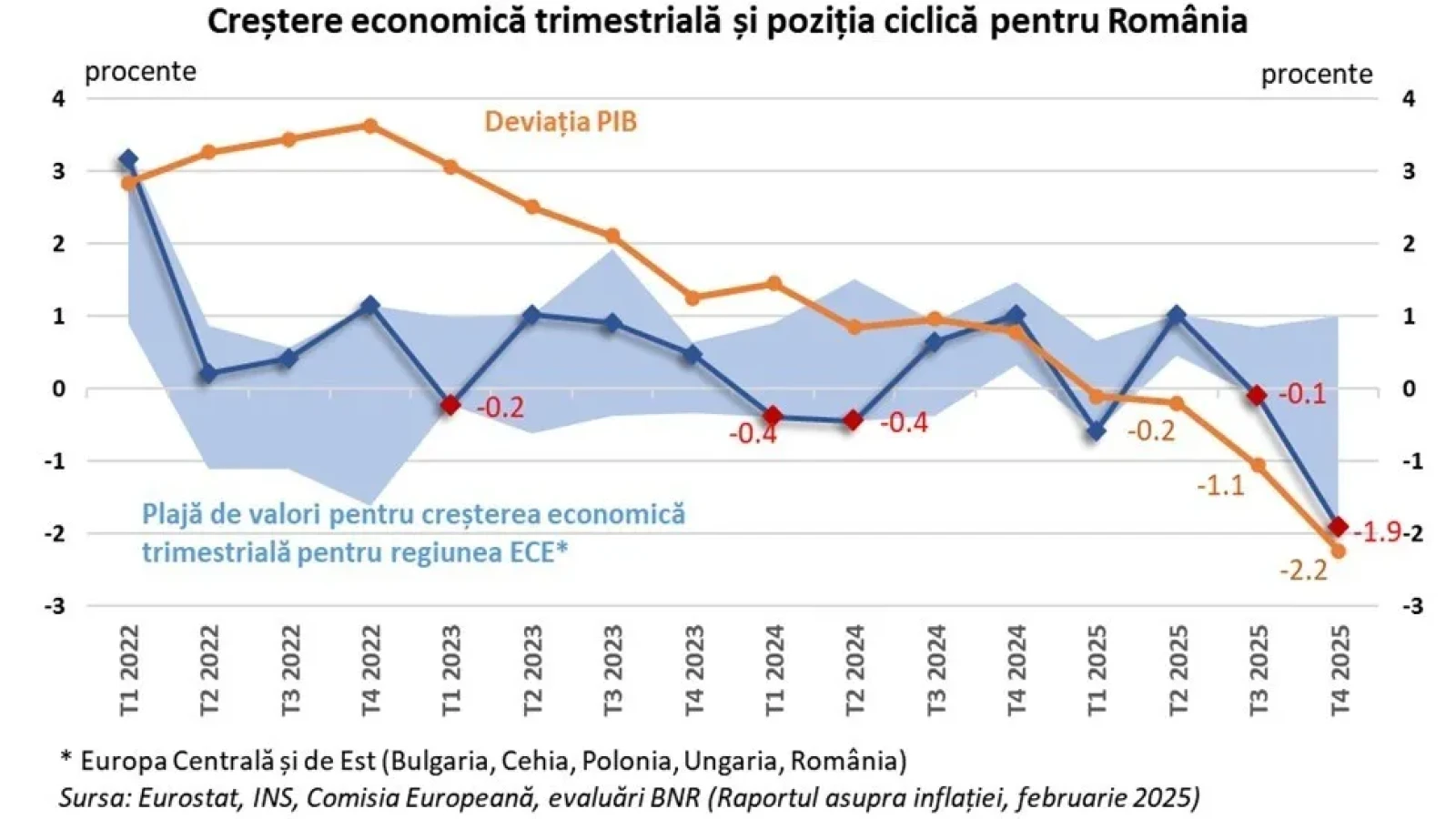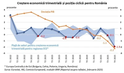 Anul 2025 a însemnat o accentuare a fazei descendente a ciclului economic, într-un context european marcat, în general, de evoluții economice modeste. Pentru ultimul trimestru al anului trecut, creșterea la nivelul UE a fost estimată la doar 0,3%, cu un spectru relativ larg între statele membre, de la -1,9% pentru România, urmată de -0,6% în Irlanda, și până la 1,7% în Lituania. De asemenea, unele țări din regiune, precum Ungaria și Cehia, au consemnat valori modeste de creștere economică, de sub 0,5%, însă Polonia a crescut cu 1%, conform datelor semnal.