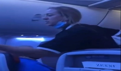 Înainte să-și continue pledoaria, un însoțitor de zbor o apucă de mână și a escortează spre ieșirea din avion.