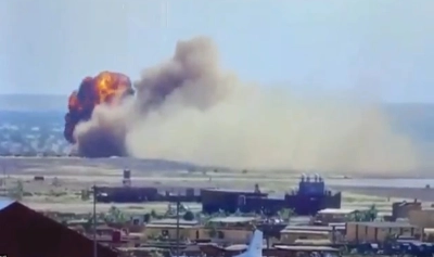 Înregistrarea surprinde un avion de tip Il-76 de fabricaţie rusă care aterizează, îşi continuă cursa nebună, iese de pe pistă, dispare într-un nor de praf şi apori explodează.