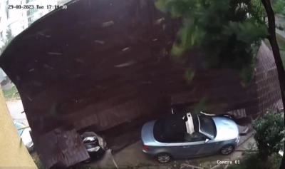 Camerele de supraveghere din Satu Mare au surprins un moment dramatic în timpul furtunii de marți din municipiu. Un acoperiș al unui bloc de pe strada Măcinului este smuls de vânt și aruncat peste două mașini care erau parcate în fața imobilului.