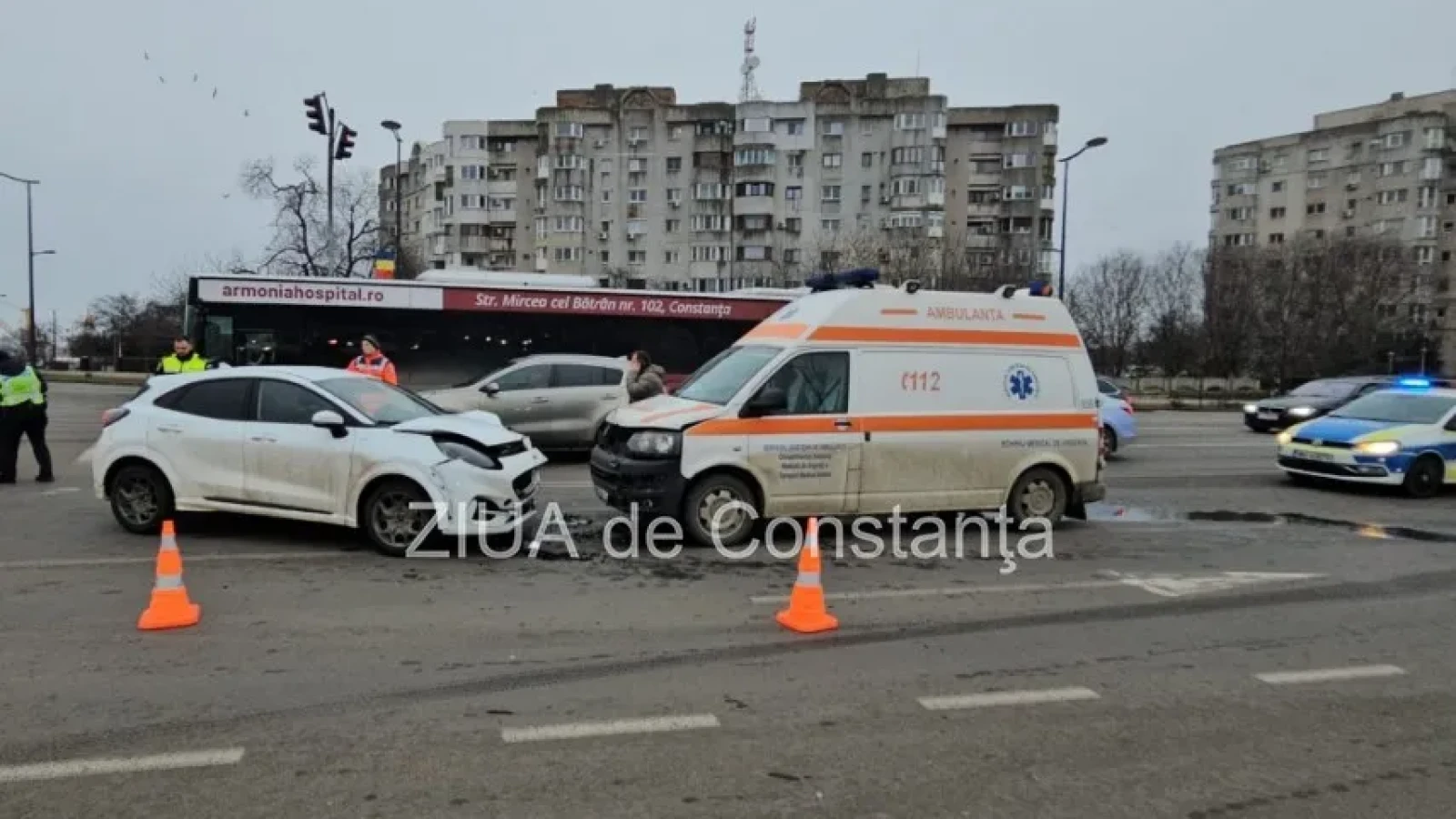 În această dimineață, un accident rutier s-a produs în zona Gării din Constanța, mai exact la intersecția dintre bulevardul 1 Mai și strada Theodor Burada. Una dintre mașinile implicate a fost o ambulanță aflată în misiune. Vehiculul medical se deplasa la un caz, cu semnalele acustice și luminoase pornite, în momentul în care a fost implicat în coliziune.