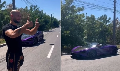 Tate, care a declarat ieri reporterilor în fața casei sale din București că va fi „absolut exonerat” de acuzațiile de viol și trafic de persoane, a postat o înregistrare video în care radiază în timp ce i se livrează un McLaren mov.