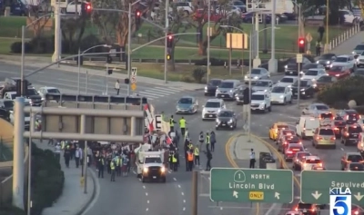 Grupul a mărşăluit pe podul Sky Way peste Sepulveda, blocând toate benzile de circulaţie care duc către aeroport.