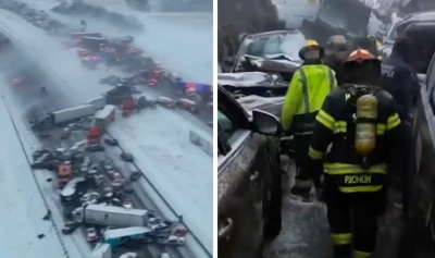 Imaginile de la fața locului arată zeci de mașini, camioane și semiremorci împrăștiate pe șoseaua acoperită de zăpadă, iar câțiva șoferi au ieșit din vehicule pentru a evalua situația.