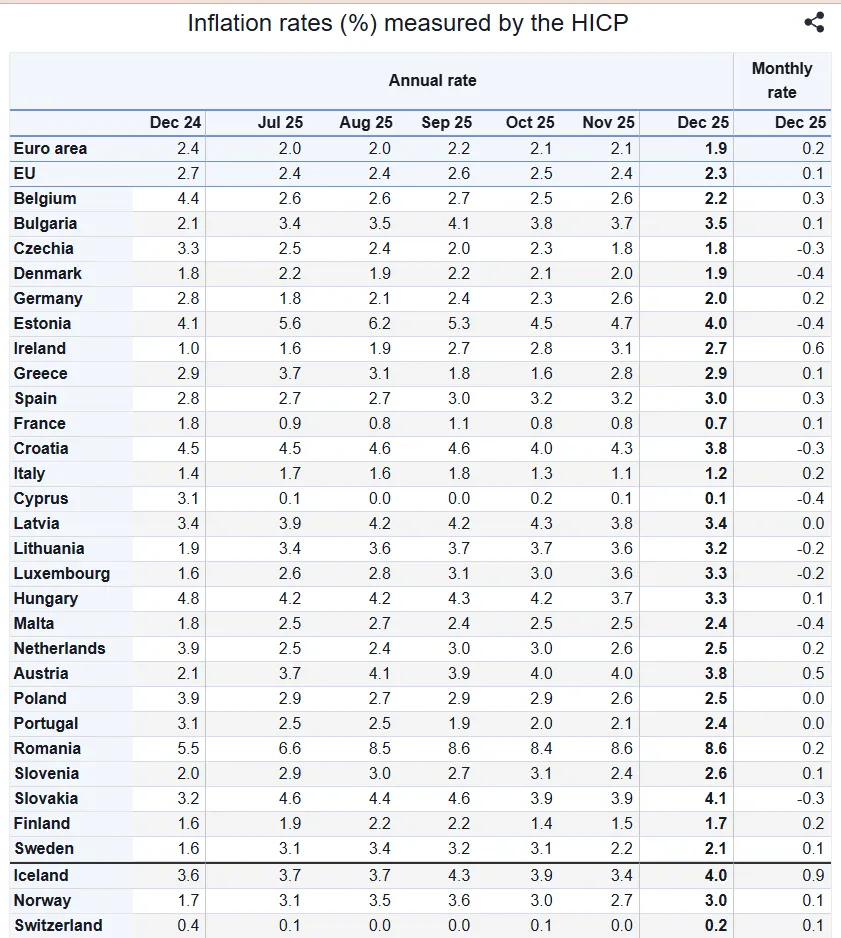 Rata anuală a inflației în zona euro a fost de 1,9% în decembrie 2025, în scădere față de 2,1% în noiembrie. Cu un an înainte, rata era de 2,4%. Inflația anuală în Uniunea Europeană a fost de 2,3% în decembrie 2025, în scădere față de 2,4% în noiembrie. Cu un an înainte, rata era de 2,7%