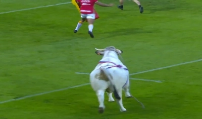 O scenă cu totul neobişnuită a avut loc vineri seară, la Perpignan, înaintea meciului de rugby în XIII, dintre Catalan Dragons şi Saint-Helens. După o scurtă prezentare a taurilor premiaţi la ultimul salon agricol de la Paris, un fermier a fost surprins de entuziasmul animalului său, care a fugit pe teren alături de jucători.