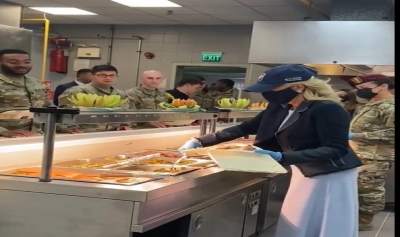 Prima Doamnă a Statelor Unite, Jill Biden, le-a servit mâncare, vineri seara, militarilor americani aflaţi la Baza Aeriană de la Mihail Kogălniceanu.