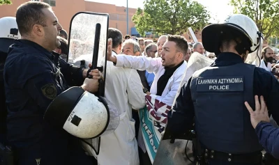 Tensiuni la Spitalul Universitar General Attikon din Atena, unde polițiștii în echipament antirevoltă au folosit spray cu piper, scuturi și bastoane pentru a dispersa un grup de medici care încercau să se întâlnească cu premierul Kyriakos Mitsotakis.