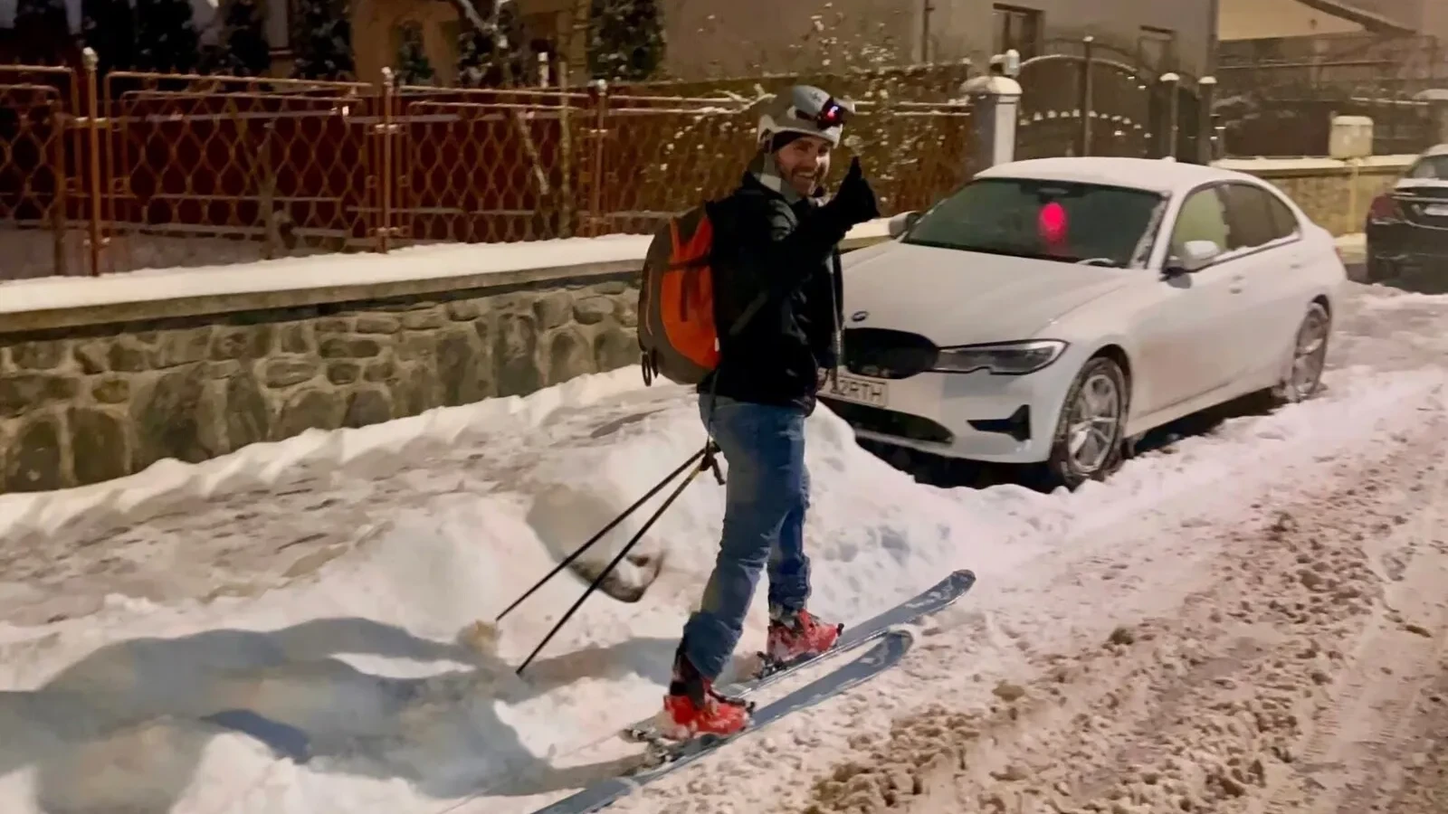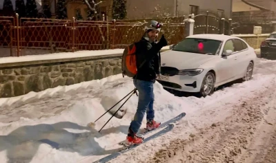 Un bărbat a fost filmat de purtătorul de cuvânt al Consiliului Judeţean (CJ), Thomas Roth, cum se deplasează la serviciu, pe schiuri de tură, pe o stradă din municipiul Sibiu, scrie Agerpres.