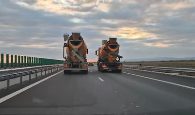 Imagini cu două betoniere care circulă în paralel, pe Autostrada A7, din direcţia Buzău spre Focşani, au fost publicate pe Facebook, sub denumirea ”Cursă pe A7”.