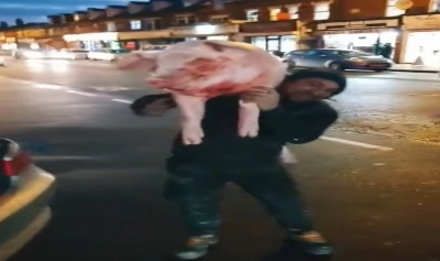 În capitala Angliei, câţiva români au tăiat porcul, l-au băgat într-un portbagaj, iar apoi l-au scos şi l-au dus pe stradă. Acolo, l-au luat în spinare și au început să se plimbe cu el.