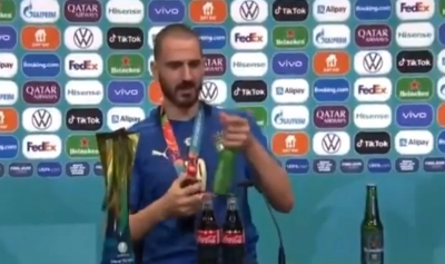 Bonucci a apărut la conferinţa de presă cu trofeul pentru cel mai bun jucător, dar având în mână o sticlă de Coca Cola şi una de bere Heineken.
