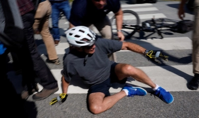 Președintele SUA, Joe Biden (79 de ani), a căzut sâmbătă de pe bicicleta sa în Delaware. „Sunt bine”, a zis liderul american după ce și-a agățat piciorul într-o pedală. El se plimba cu bicicleta lângă casa sa de vacanță și incidentul s-a petrecut când s-a oprit să-i salute pe unii cetățeni care așteptau să-l vadă.