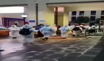 În imaginile video obținute de sursa citată pot fi văzuți mai mulți elevi, cu ghiozdanele în spate, îmbrăcați în costume speciale de protecție.
