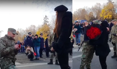 Andrei Pop, soldat al Batalionului 52 Geniu Tisa, și-a surprins iubita cu o cerere în căsătorie inedită. Totul s-a întâmplat în centrul municipiului Satu Mare, chiar înainte debutului manifestărilor dedicate zilei de 1 Decembrie, potrivit portalsm.ro, anunță romaniatv.net.