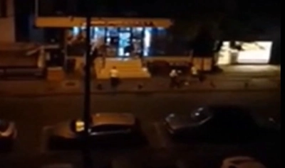 Bătaia are loc în stradă şi pe scările unui magazin.