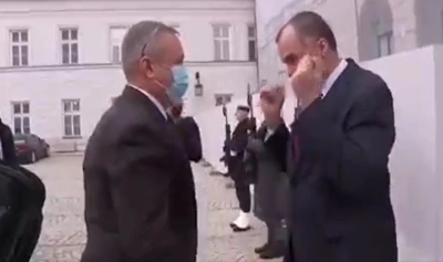 La sosirea la Palatul Prezidențial din Varșovia, premierul Ciucă a fost întâmpinat de un angajat al administrației prezidențiale poloneze, care l-a condus la președintele Duda. Nu înainte de a-i solicita oficialului român să-și dea jos de pe față masca de protecție.