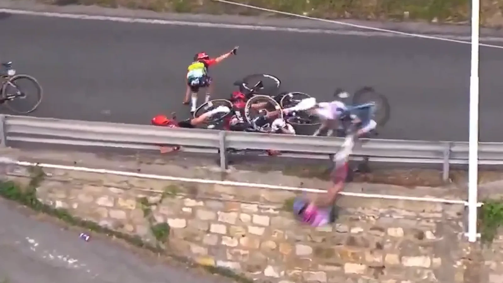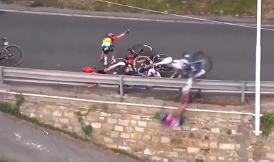 În doar câteva secunde, alte cicliste au intrat în plin în cele căzute pe asfalt. Două dintre ele au fost proiectate peste bariera de protecție, într-o zonă abruptă, câțiva metri mai jos.