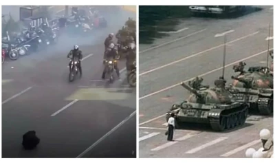 Aceste imagini, distribuite şi redistribuite pe reţelele de socializare, în special în afara ţării, le amintesc unor utilizatori de internet de bărbatul care se confruntă cu o coloană de tancuri în Piaţa Tiananmen din Beijing în timpul represiunii mişcării chineze, în iunie 1989, care cerea reforme democratice.