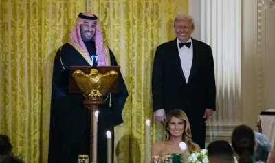 Prințul moștenitor al Arabiei Saudite saudit Mohammed bin Salman a fost primit la Washington de către Donald Trump, care a oferit și un dineu în onoarea aceastuia. În discursul de la dineu, prințul a glumit pe seama vestimentației sale, tradițional saudită, susținând că unii au pariat că va veni purtând un costum negru. Gluma lui Mohammed bin Salman face trimitere evidentă la președintele Ucrainei, Volodimir Zelenski, cel care a fost certat în Biroul Oval că a venit îmbrăcat cu haine în stil militar, în loc să poarte un costum.