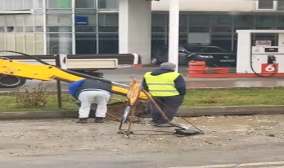 Jurnalistul Robert Turcescu a publiat o filmare din Slatina, în care mai mulți muncitori strâng apa în cupa unui excavator și apoi o aruncă într-un canal.