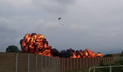 O înregistrare video arată cum pilotul avionului, un MB.339, se parașutează din aeronava care a căzut.