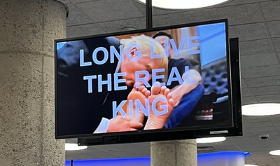 Inscripţia ”Viaţă lungă adevăratului rege” (”Long live the real king”) este suprapusă cu majuscule peste imagine, o aluzie la un mesaj recent cu aceste cuvinte de către Donald Trump pe platforma sa Truth Social.