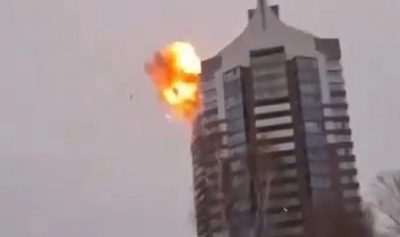 Canalul Telegram Baza, care este apropiat de serviciile de securitate ale Rusiei, a publicat imagini video neverificate care arată un obiect aerian care se prăbuşeşte într-o clădire înaltă, producând o minge de foc mare.