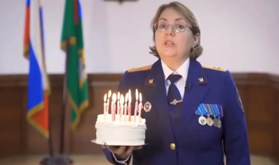 ”Ai făcut 14 ani? Felicitări!”, spune o polițistă în uniformă ce ține un tort cu lumânări, într-un clip video publicat joi de Comitetul de Investigații din Moscova.
